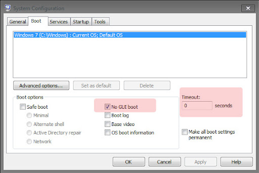 3. Klik di Tab "Boot" pada Sytem Configuration. Ceklik "No GUI boot" dan ganti timeout menjadi "0" atau "3". Kemudian Ok